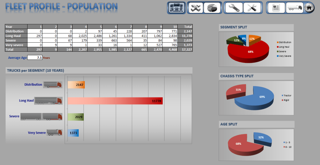 In this project, I analysed the total active population of Volvo trucks in the country over a 10+ year lifecycle, segmented by usage severity (Distribution, Long Haul, Severe, Very Severe).
