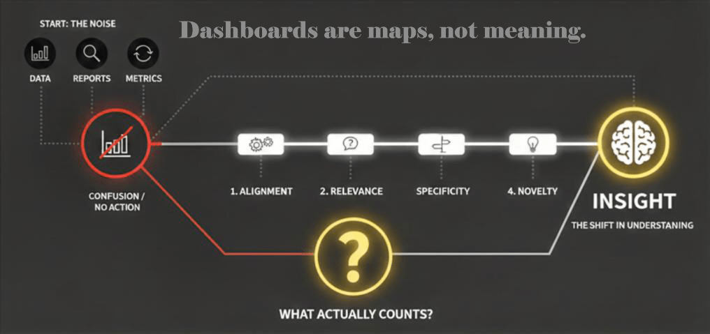 Across reviews of dashboards and reports, the same pattern appears. Alignment is missing, relevance is partial, specificity is rare, and novelty is almost absent. As a result, many outputs remain descriptive rather than cognitive. Insight is not the chart. Insight is the new understanding that emerges from it.